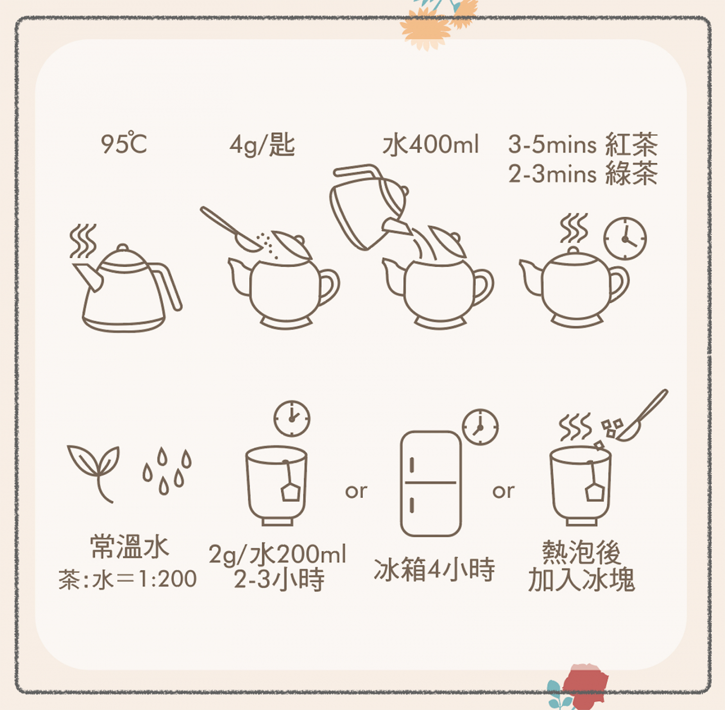 現煮沸騰熱水注入茶壺(約95~98度C最佳) 沖泡茶葉,並依照不同茶葉採用不同浸泡時間。若是混搭不同茶葉等級則建議浸泡4~5分鐘左右。 -