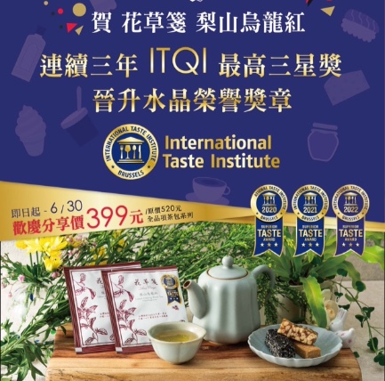 花草箋-得獎歡慶活動. ✮ 歡慶-獲國際 ITQI 最高榮譽獎-活動開跑 ✮ 即日起至6月30日, 全品項茶包系列,原價 520元。 ☛ 活動期間歡慶分享價 399元。 ❙ 梨山烏龍紅 ❙ ┈┈┈┈┈┈┈┈┈┈┈┈┈┈┈┈┈┈ 琥珀亮紅茶湯,帶高山松木香氣,熟果蜜甜口感,醇厚圓滑,層次豐富滋味甘醇。 為了感謝一路以來支持好友,在這次 #梨山烏龍紅 因為連續三年拿到三星等級絕佳風味獎,因而晉升水晶榮譽獎章的肯定,花草箋想將這喜悅分享大家,一起同歡慶! 梨山烏龍紅下單連結